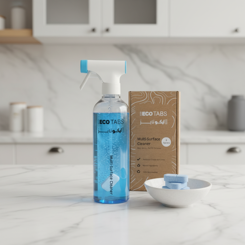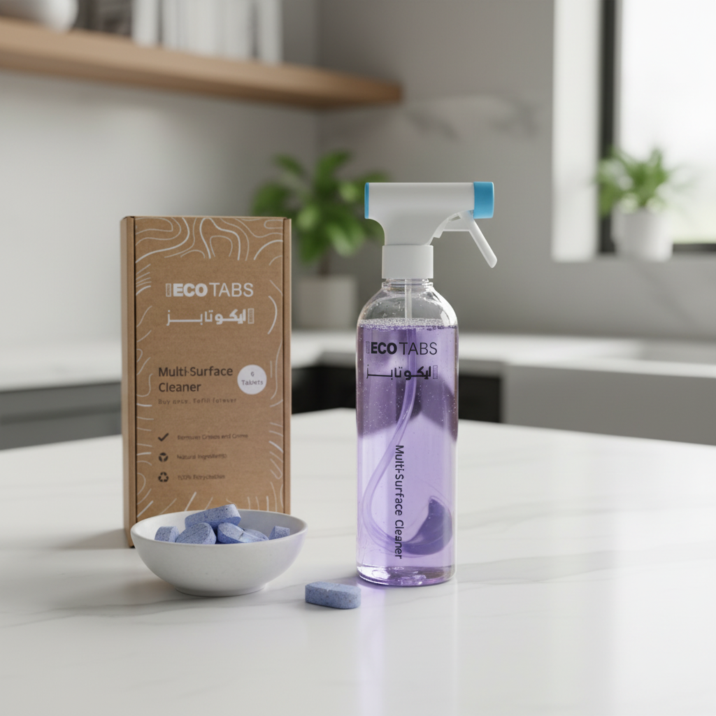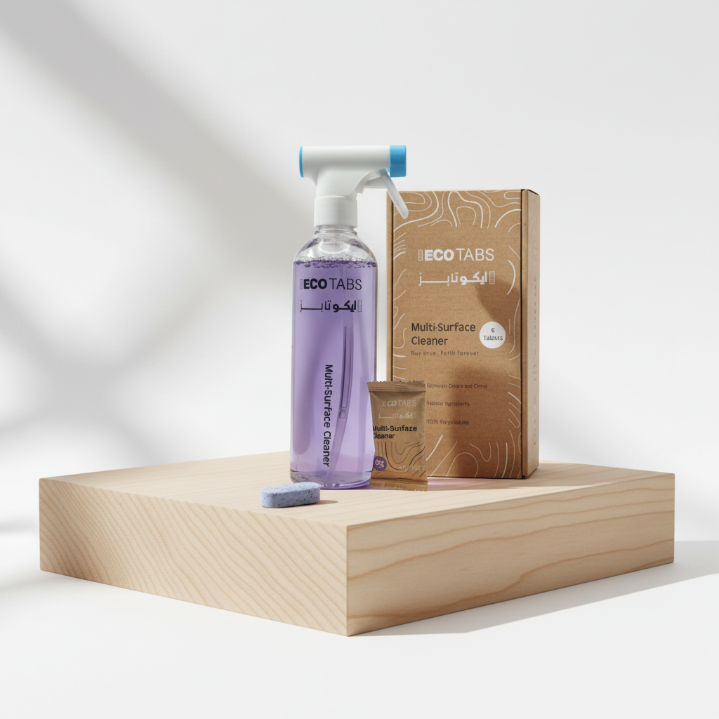 تُعد ECO TABS نظام تنظيف مستدام للأسطح المتعددة يساعدك على تقليل النفايات البلاستيكية مع الحفاظ على نظافة منزلك. بدلاً من شراء عبوات بلاستيكية جديدة في كل مرة، تسمح لك ECO TABS بإعادة تعبئة الزجاجة بشكل دائم باستخدام أقراص تنظيف صغيرة وقابلة للذوبان.