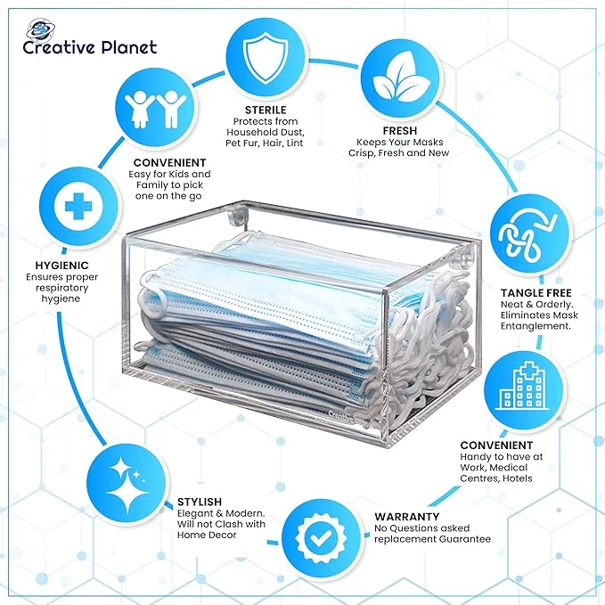 حفظ صحي للكمامات: صندوق أكريليك شفاف يوفر حلاً نظيفاً ومنظماً لحفظ الكمامات وحمايتها عند عدم الاستخدام. تصميم شفاف وأنيق: يسمح الجسم الأكريليكي برؤية الكمامات بسهولة دون فتح العلبة. إغلاق محكم: يمنع وصول الغبار والأوساخ ويحافظ على نقاء الكمامات. مناسب لكمامات برو كي إف ٩٤: مصمم ليلائم مقاس كمامات برو كي إف ٩٤. محمول وصغير الحجم: سهل الحمل داخل الحقيبة أو الجيب ليبقى الكمام جاهزاً للاستخدام.