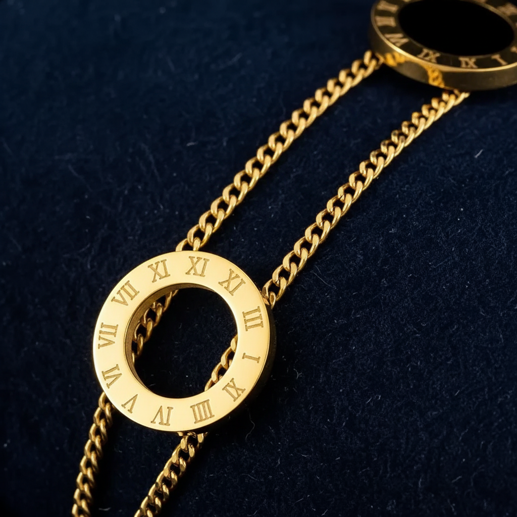 Elevate your style with our stunning golden plated Roman numerals bracelet. This exquisite bangle combines timeless design with modern durability, making it an ideal accessory for any occasion. Perfect for those seeking a sophisticated and long-lasting piece of engraved jewelry.