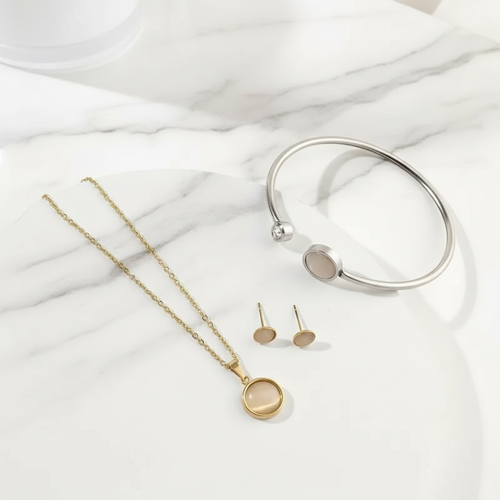 Elevate your style with our durable and hypoallergenic stainless steel jewelry set. Includes a chic necklace, bracelet, and earrings for a complete look.