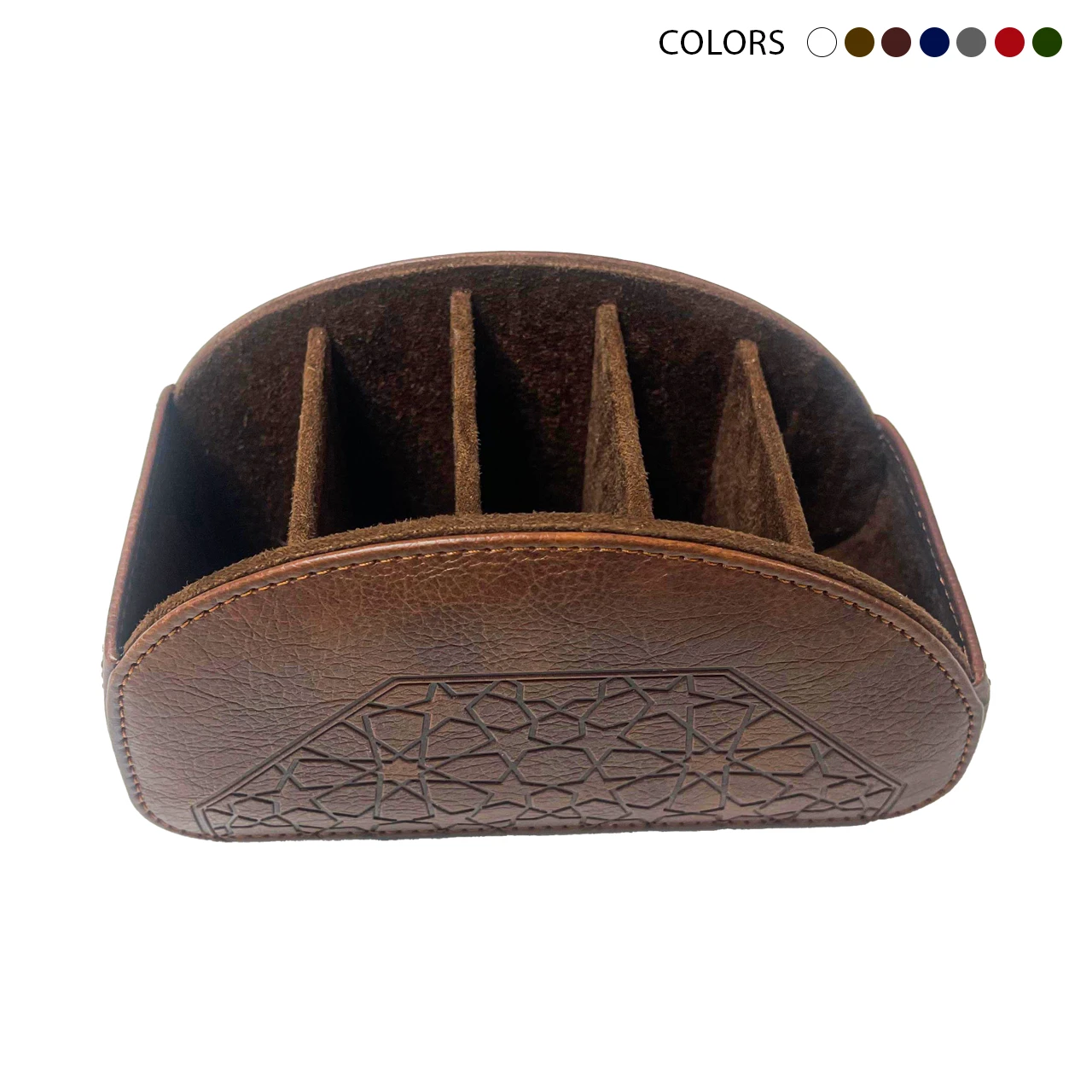 Keep surfaces tidy with this leather remote control holder and multi-compartment leather desk organizer. The decorative leather pouch features a soft suede-like finish and a muted grey floral pattern with color options. Separate compartments store remotes, glasses, pens, smartphones and small access...