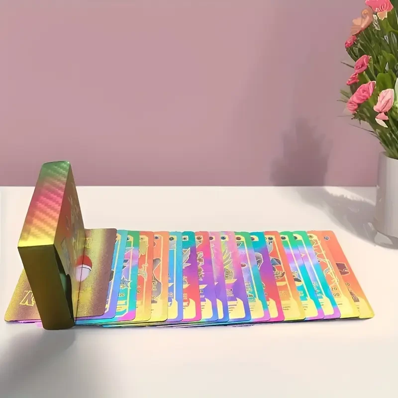 Bright, colorful Pokémon rainbow metal trading cards — a premium 55-card collectible set featuring fan-favorite characters. Each high-quality metal card has a vivid holographic finish and comes in a durable decorative storage box. Perfect for kids, collectors, and gift-givers; ideal for display, pla...